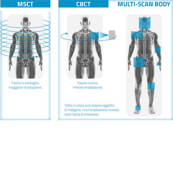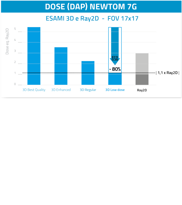 A tecnologia CBCT de emissão pulsada ativa a fonte de raios-X apenas quando necessário, limitando assim a exposição. Além disso, a tecnologia SafeBeam ™ adapta automaticamente as emissões às características anatômicas do paciente, eliminando qualquer risco de superexposição. Além disso, os radiologistas podem modular as emissões manualmente para reduzir ainda mais a dose.