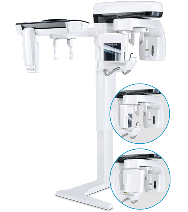 Além disso, o sistema de colimação do exame cefalométrico é baseado no movimento automático da torre, que gira e abaixa o sensor, criando uma abertura para os raios X direcionados ao sensor 2D no braço telerradiográfico.
